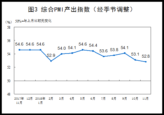 2018年11月份,综合PMI产出指数为52.8%,比上月回落0.3个百分点,活跃度有所减弱。