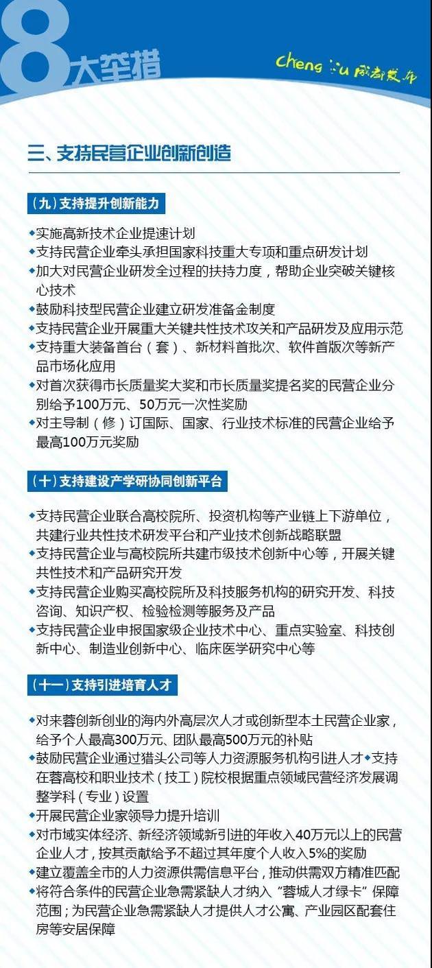 支持引进培育人才。对来蓉创新创业的海内外高层次人才或创新型本土民营企业家,给予个人最高300万元、团队最高500万元补贴。鼓励民营企业通过猎头公司等人力资源服务机构引进人才,按其引才成本的50%给予最高10万元补贴。支持在蓉高校和职业技术(技工)院校根据重点领域民营经济发展调整学科(专业)设置,给予最高2000万元补贴。开展民营企业家领导力提升培训,定期选派民营企业家到国内外重点高校院所、行业领军企业学习交流。对市域实体经济、新经济领域新引进的年收入40万元以上的民营企业人才,按其贡献给予不超过其年度个人收入5%的奖励。建立覆盖全市的人力资源供需信息平台,推动供需双方精准匹配。将符合条件的民营企业急需紧缺人才纳入“蓉城人才绿卡”保障范围,分层分类提供落户、子女入园入学、医疗、住房、创业扶持、出入境和停居留等综合服务,提供人才公寓、产业园区配套住房等安居保障。