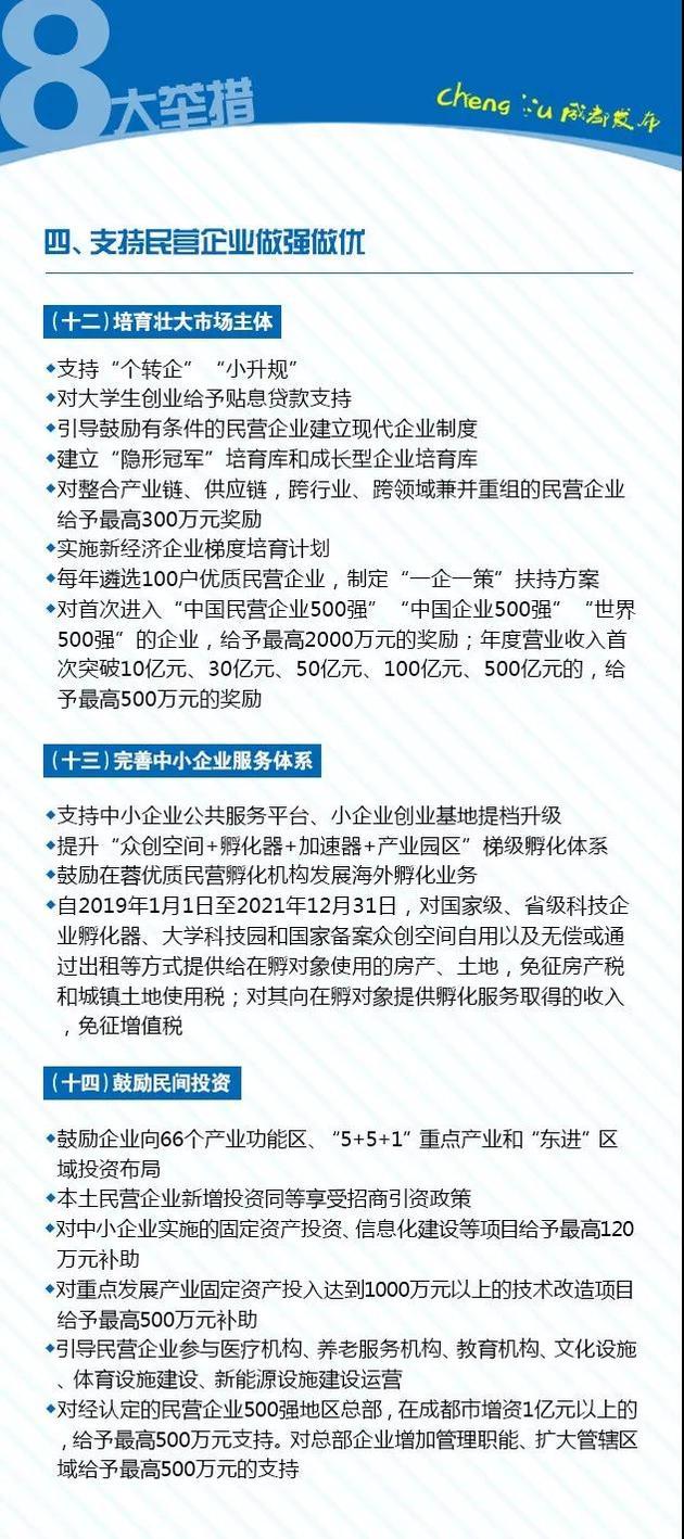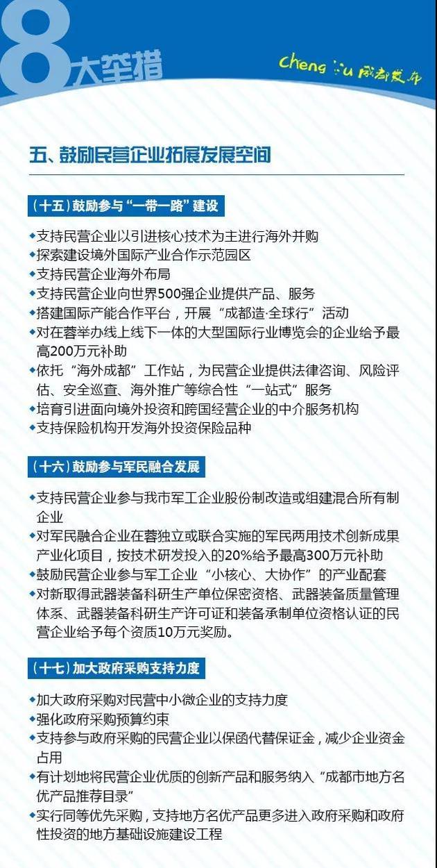 鼓励民间投资。发挥财政资金引导作用,通过投资补助、贷款贴息、设立基金等方式,鼓励民营企业向66个产业功能区及园区、“5+5+1”重点产业和“东进”区域投资布局。本土民营企业新增投资同等享受招商引资政策。对中小企业实施的固定资产投资、信息化建设等项目给予最高120万元补助。对重点发展产业固定资产投入达到1000万元以上的技术改造项目给予最高500万元补助。通过政府和社会资本合作(PPP)、政府购买服务等方式,引导民营企业参与医疗机构、养老服务机构、教育机构、文化设施、体育设施、新能源设施建设运营。对经认定的民营企业500强地区总部,在成都市增资1亿元以上的,给予最高500万元支持。对总部企业增加管理职能、扩大管辖区域给予最高500万元支持。