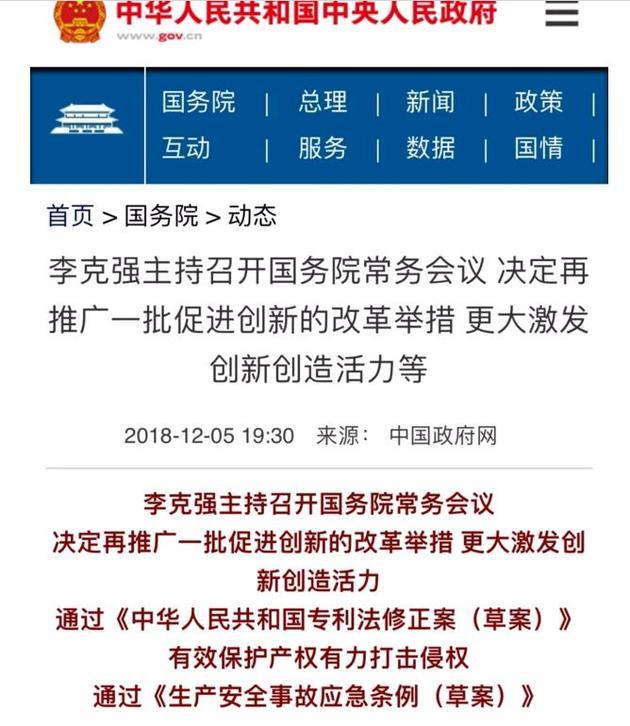 国务院常务会议明确,要进一步加强专利权人合法权益保护、完善激励发明创造的机制制度、把实践中有效保护专利的成熟做法上升为法律,会议通过《中华人民共和国专利法修正案(草案)》。草案着眼加大对侵犯知识产权的打击力度,借鉴国际做法,大幅提高故意侵犯、假冒专利的赔偿和罚款额,显著增加侵权成本,震慑违法行为;明确了侵权人配合提供相关资料的举证责任,提出网络服务提供者未及时阻止侵权行为须承担连带责任。草案还明确了发明人或设计人合理分享职务发明创造收益的激励机制,并完善了专利授权制度。会议决定将草案提请全国人大常委会审议。