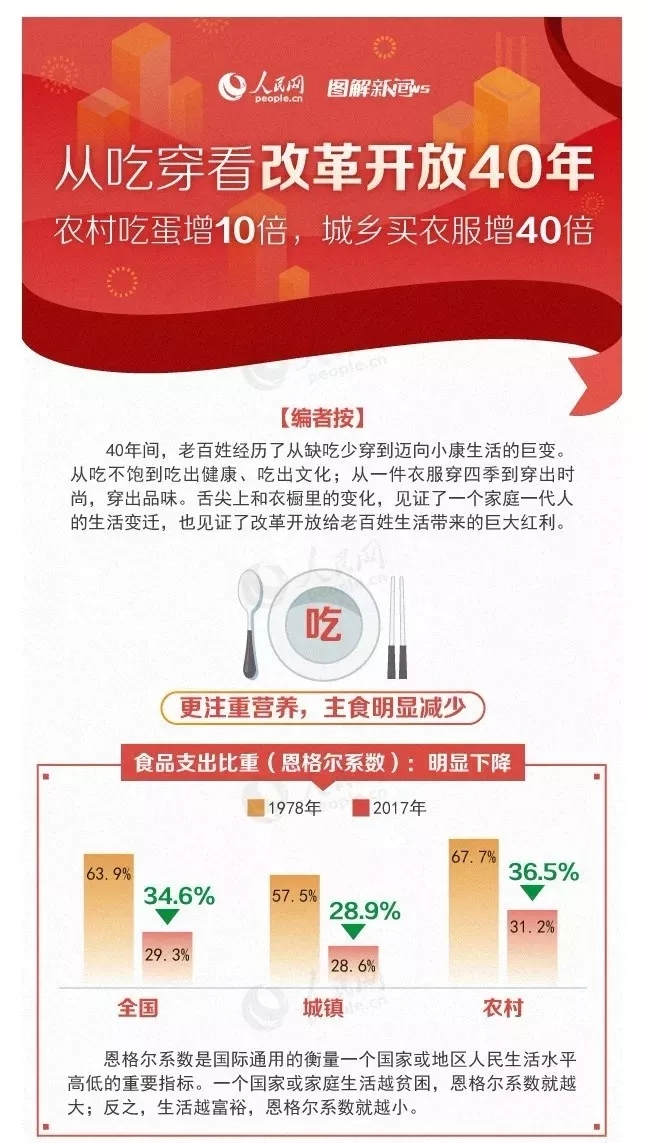 同时,长图、图解等方式也展现出了简单直接效果好的特色。人民网用图解的方式推出了《从吃穿看改革开放40年:农村吃蛋增10倍,城乡买衣服增40倍》,让我们重温了40年间,老百姓经历了从缺吃少穿到迈向小康生活的巨变。从吃不饱到吃出健康、吃出文化,从一件衣服穿四季到穿出时尚、穿出品位……让我们看到,舌尖上和衣橱里的变化,见证了一个家庭一代人的生活变迁,见证了改革开放给老百姓生活带来的巨大红利。