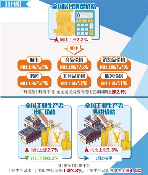 12月9日,国家统计局发布11月份全国居民消费价格指数(CPI)和工业生产者出厂价格指数(PPI)数据。11月份,CPI同比上涨2.2%,连续5个月处于“2时代”;PPI同比上涨2.7%,涨幅比上个月收窄0.6个百分点。