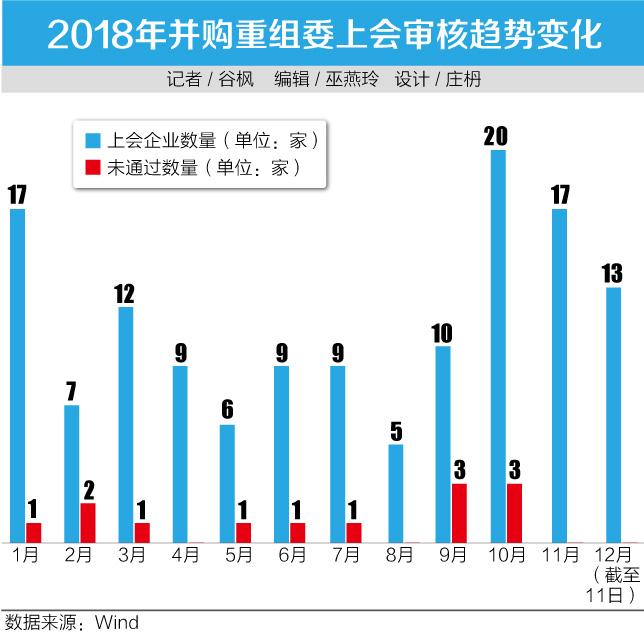 随后11月以及12月至今,审核提速的趋势越发明显,11月单月并购重组委审核企业的数量为17家,12月至今(12月11日)并购重组委已经审核了13家企业。