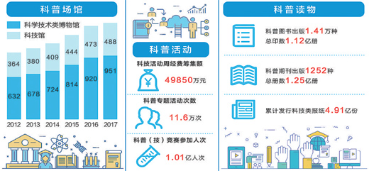 本报北京12月18日电 (记者吴月辉)18日,科技部在京发布了2017年度全国科普统计数据。统计数据表明,全国科普事业发展态势良好,科普经费持续稳定增长,科普场馆数量快速增长,科研设施加快开放,科普传播媒介日趋多样。