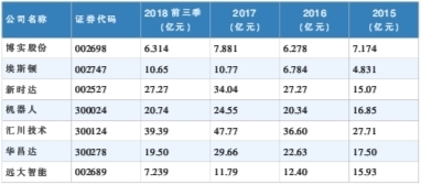 表一 七家机器人上市公司营业总收入(2015~2018前三季度)