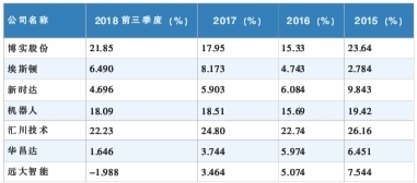表三 七家机器人上市公司营业利润率(2015~2018前三季度)