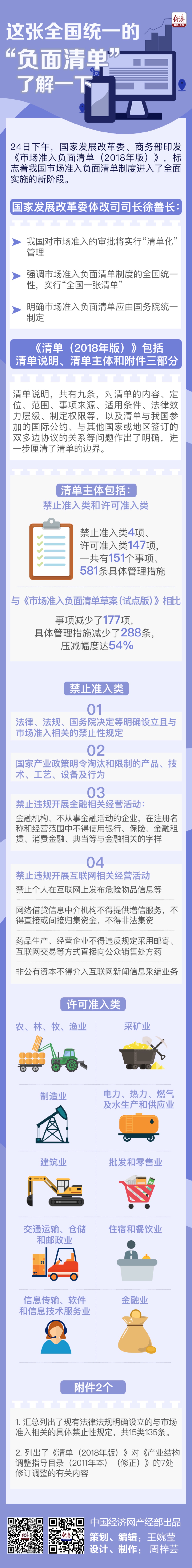 经党中央、国务院批准,国家发展改革委、商务部12月24日下午印发了《市场准入负面清单(2018年版)》,标志着我国市场准入负面清单制度进入了全面实施的新阶段。国家发展改革委体改司司长徐善长25日表示,今后,我国对市场准入的审批将实行“清单化”管理。为了建立全国统一市场,强调市场准入负面清单制度的全国统一性,还将实行“全国一张清单”,明确市场准入负面清单应由国务院统一制定,未经国务院授权,各地区各部门不得自行发布市场准入负面清单,不得擅自增减、变更市场准入负面清单条目。