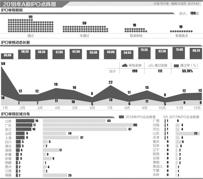 作为首届大发审委履职的首个完整年度,2018年A股IPO发审交出了一份199家次企业上会(包含取消审核、暂缓表决和二次上会情况),过会55.78%,否决29.65%的成绩单。