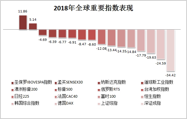 值得一提的是,在上述16个全球重要指数中,2018年表现最好的是巴西圣保罗IBO指数,全年涨幅近12%,意外成为新兴市场中的一匹“黑马”。在巴西国内经济不景气时,极右派博索纳罗当选总统使投资者对经济信心增强,助推了该国股市大涨。