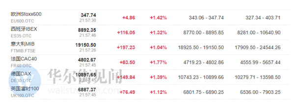 美股开盘前,欧洲STOXX指数涨幅扩大至1.42%,创近三周以来最高,零售股和地产股涨幅居前。西班牙IBEX指数涨1.32%,意大利MIB指数涨1.04%,法国CAC 40指数涨1.77%,德国DAX指数涨1.39%。