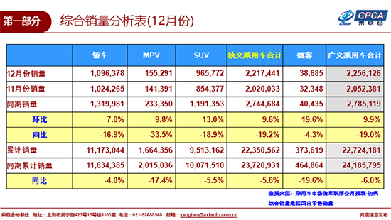 昨日(1月9日),全国乘用车市场信息联席会(以下简称“乘联会”)发布数据显示:2018年12月,我国狭义乘用车销量为2217441辆,同比下降19.2%,环比涨幅为9.8%。由此,我国狭义乘用车市场全年数据也正式出炉,2018年全年,我国狭义乘用车累计销量达到22350562辆,同比下降5.8%。