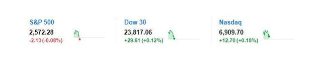 美股全线高开。标普500指数高开7.11点,涨幅0.28%,报2581.52点。道琼斯工业平均指数高开101.03点,涨幅0.42%,报23888.48点。纳斯达克综合指数高开23.33点,涨幅0.34%,报6920.33点。