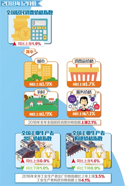 2019年1月10日,国家统计局发布了全国居民消费价格指数(CPI)和工业生产者出厂价格指数(PPI)数据。2018年全年,CPI同比上涨2.1%,同比涨幅比上年扩大0.5个百分点,完成了年初提出的“居民消费价格涨幅3%左右”预期目标;PPI同比上涨3.5%,涨幅比上年回落2.8个百分点。