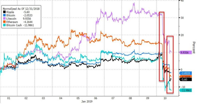 其他主流币表现同样惨不忍睹:以太币跌约15%,价格徘徊在130美元左右;瑞波币跌逾10%;比特币现金跌近20%。自此,在开年11天后,上述所有数字货币已经抹去年内全部涨幅,甚至跌得愈发惨烈。