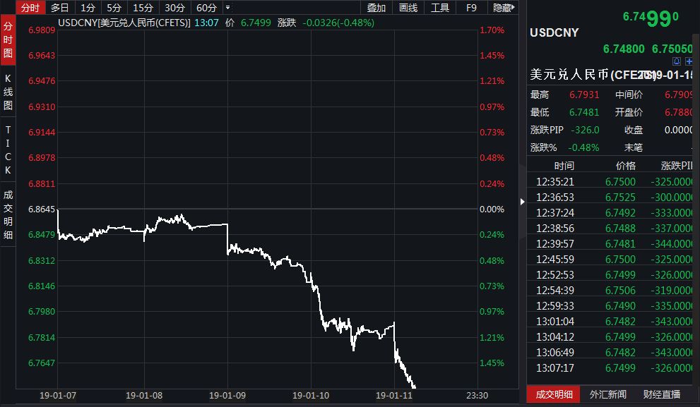 如果从1月7日收盘价6.8499算起,近一周时间内,在岸人民币升值幅度超1000点。