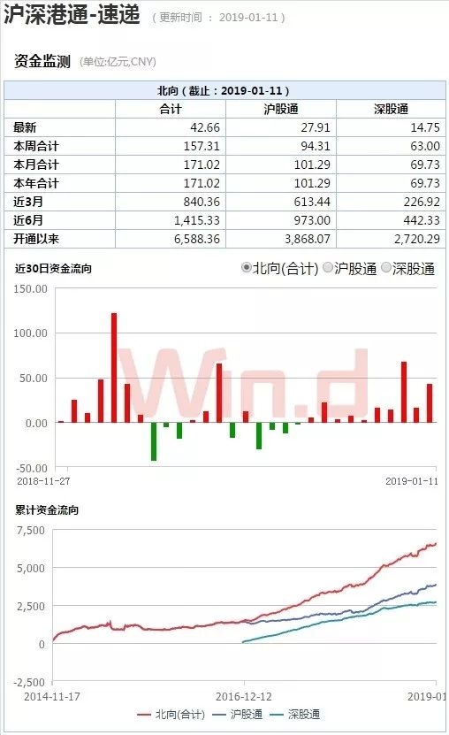 Wind数据显示,随着沪深港通的开通,北向资金累计流入已经超过6500亿元,2019年以来不到半个月的时间,北向资金已经净流入达171.02亿元。