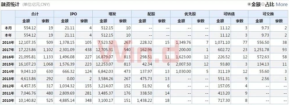 Wind数据显示,从2018年股权融资情况来看,在IPO金额及增发金额上均低于此前三年。随着未来科创板的落地和注册制的实施,股权融资有望实现快速增长。