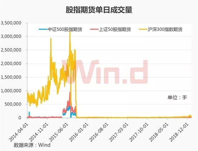 Wind数据显示,从股指期货单日成交量来看,近年来变化巨大,2014年上半年,当时股指还处于历史底部的时候,沪深300指数期货单日交易量维持在60万手左右,随后因A股市场大幅拉升,股指期货成交量均大幅攀升,2015年下半年以来,因对股指期货采取限制交易等措施,成交量大幅萎缩。当前虽有部分放开,但相比之前仍有较大差距。