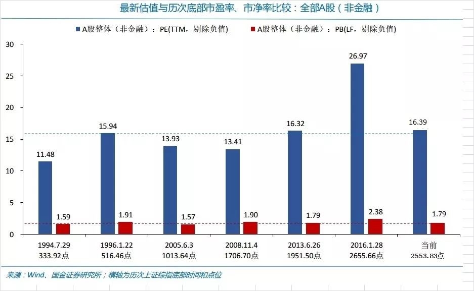 Wind数据显示,当前A股市场确实已经“非常便宜”。目前,A股整体(非金融)市盈率仅为16倍左右,市净率在1.8倍左右。对比历史上多次熊市低点的估值看,几乎与此前数次底部估值持平。