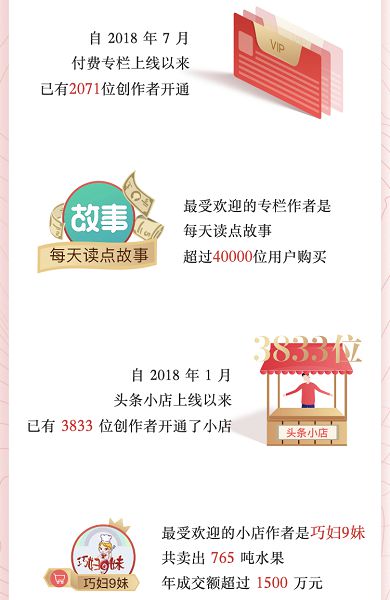 创作者们除了在今日头条平台上生产优质内容,同时从今日头条平台上获得了可观的收益。根据2018年头条创作者大数据,自2018年7月,已有2071位创作者开通今日头条付费专栏,其中专栏“每天读点故事”获得超过4万次购买。同时,自2018年1月,已有3833位创作者开通了小店。其中,创作者“巧妇9妹”通过今日头条小店卖出765吨水果,年成交额超过1500万元。