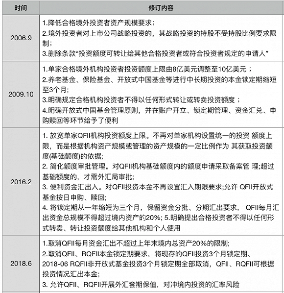 2016年以来,监管层推动实施QFII外汇管理改革,2016年取消单家机构投资额度上限、取消机构投资资金汇入期限要求、放宽单家机构QFII投资额度上限。同年证监会取消QFII资产配置比例的限制。2018年取消QFII资金汇出20%比例要求、取消QFII本金锁定期要求、允许QFII开展外汇套期保值等。