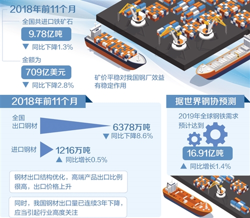 2018年前11个月,全国共进口铁矿石9.78亿吨,同比下降1.3%,金额为709亿美元,同比下降2.8%,矿价平稳对我国钢厂效益有稳定作用。于勇分析,上游铁矿石市场稳定,一方面与全球矿石供大于求的市场形势密切相关,另一方面也得益于我国与国际各大矿山深度沟通、形成共识。此外,钢企采购趋于理性也是重要原因。