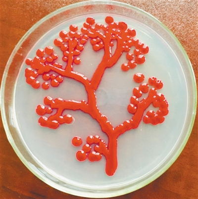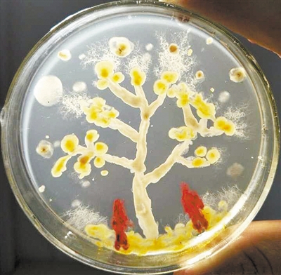 该校负责此次比赛的穆老师介绍,微生物作画的原理其实就是菌种的培养,从自然环境中找到合适的菌种,根据它们自身不同的颜色,利用无菌操作等方式,让菌种长成一幅漂亮的画。