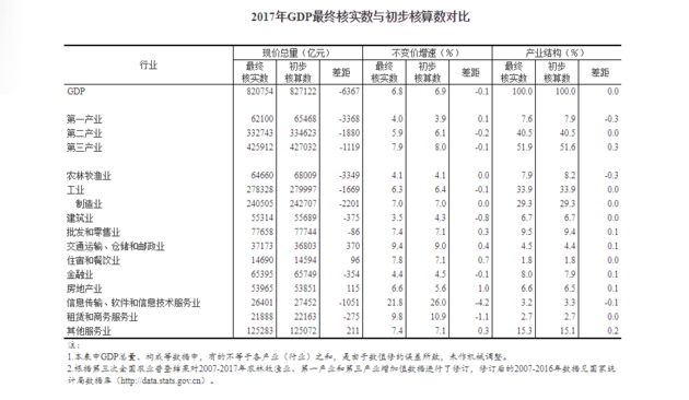 经最终核实,2017年,GDP现价总量为820754亿元,比初步核算数减少了6367亿元;按不变价格计算,比上年增长6.8%,比初步核算数下降0.1个百分点。