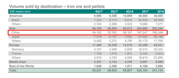 在淡水河谷公司74年的发展历史中,有40多年都有着中国的影子。1973年淡水河谷的货轮首次驶抵中国,1994年在上海设立办事处,现如今中国已经成为淡水河谷最大的市场,其2017年生产的3.4亿吨铁矿石,有约2亿吨都卖给了中国。