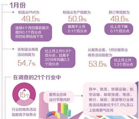 专家表示,1月份制造业和非制造业PMI双双回升,其中服务业商务活动指数回升明显,表明经济运行有企稳迹象,非制造业稳增长的基础动力依然较好。不过,制造业和非制造业后期走势有待观察,运行趋稳的基础仍需进一步巩固。