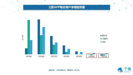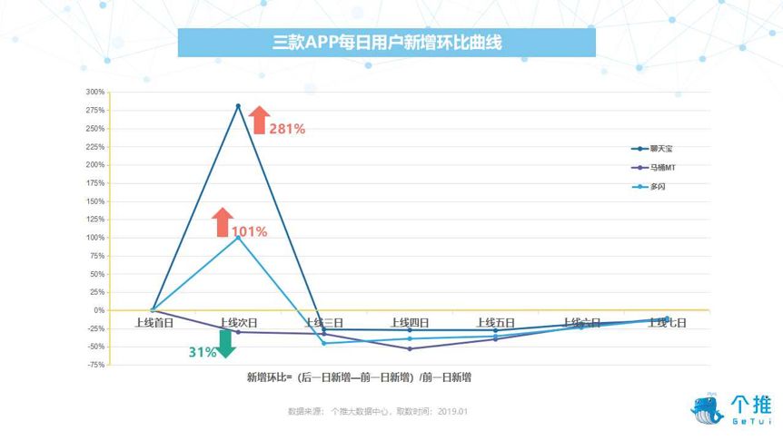统计结果显示,自1月15日聊天宝、马桶MT、多闪三款社交产品同一天发布后,在15日以及16日形成爆发式增长,其中聊天宝16日相比15日新用户增长达到281%,多闪增长达到101%,之后都出现不同程度的新增用户增速下降,而马桶MT更是在发布次日就已出现了下降。
