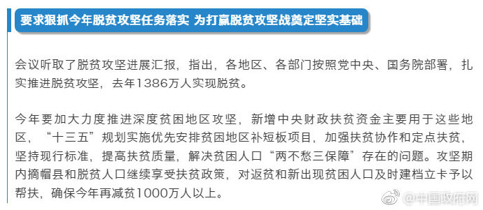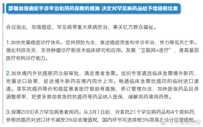[今天的国务院常务会定了这4件大事]听取2018年全国两会建议提案办理工作汇报,推进提升政府施政水平;要求狠抓今年脱贫攻坚任务落实,为打赢脱贫攻坚战奠定坚实基础;部署加强癌症早诊早治和用药保障的措施,决定对罕见病药品给予增值税优惠;决定支持商业银行多渠道补充资本金,增强金融服务实体经济和防风险能力。2月11日的国务院常务会定了这4件大事。会上,李克强总理作出了哪些部署?