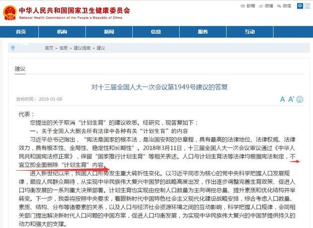 针对代表提出的“关于全国人大删去所有法律中各种有关‘计划生育’的内容”,国家卫健委答复称:“习近平总书记指出,‘宪法是国家的根本法,是治国安邦的总章程,具有最高的法律地位、法律权威、法律效力,具有根本性、全局性、稳定性和长期性’。2018年3月11日,十三届全国人大一次会议审议通过《中华人民共和国宪法修正案》,保留‘国家推行计划生育’等相关表述。人口与计划生育法等法律均根据宪法制定,不宜立即全面删除‘计划生育’内容。”(国家卫健委网站)