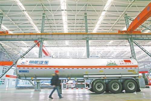 一名访客从山东省邹平市明航汽车全铝罐车生产车间走过(1月11日摄)。 新华社记者 潘思危摄