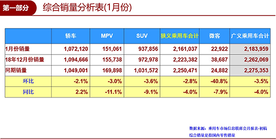 2月18日,全国乘用车市场信息联席会(以下简称“乘联会”)发布数据显示:1月,我国狭义乘用车销量为2161037辆,同比下降4.0%,环比下降2.8%。虽然仍同环比双降,但相比于2018年4季度15.0%的降幅,2019年1月车市的表现已有大幅改善。
