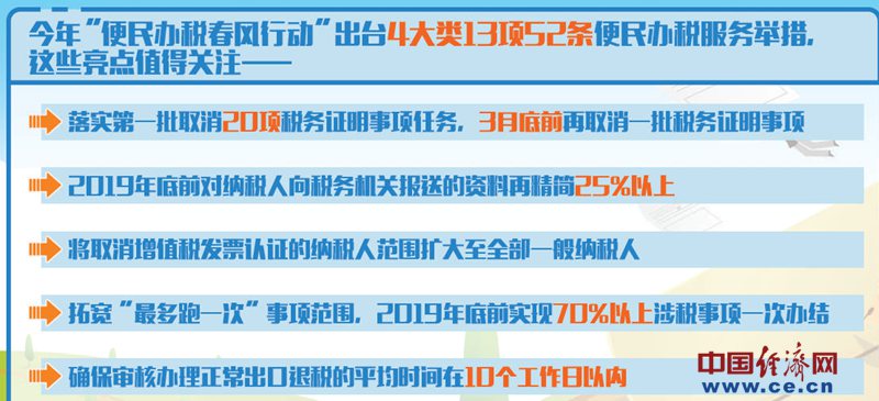 同时,税务部门将在2019年3月底前再取消一批税务证明事项,实现2019年底前对纳税人向税务机关报送的资料再精简25%以上。