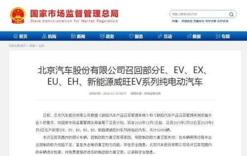 北汽召回部分新能源汽车。国家市场监督管理总局官网。