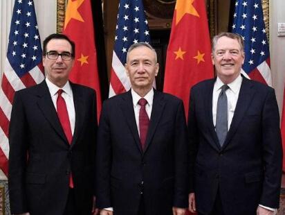 当地时间2月21日上午,习近平主席特使、中共中央政治局委员、国务院副总理、中美全面经济对话中方牵头人刘鹤与美国贸易代表莱特希泽(右)、财政部长姆努钦(左),在美国白宫艾森豪威尔行政办公楼共同主持第七轮中美经贸高级别磋商开幕式。 新华社记者 刘杰 摄