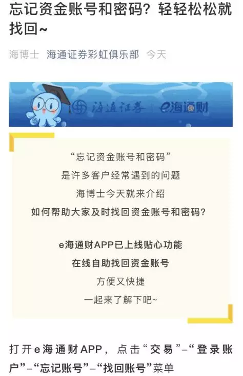 海通证券零售与网络金融部相关业务人士告诉券商中国记者,因行情转好,公司业务处理量暴增,营业部员工有时候午饭都顾不上吃。公司通过线上平台来增加服务覆盖和提升服务效率。例如,近日大量客户来电查询自己的账号和密码,对此,海通证券特地通过e海通财APP和微信公众号推出了指导客户查询账号和密码的指南。