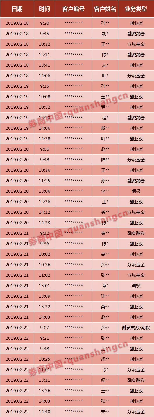 记者拿到的该营业部上周预约开通业务情况的表单,交易时间内基本都安排了客户来开通业务,开通的业务主要包括融资融券、分级基金、创业板和期权。
