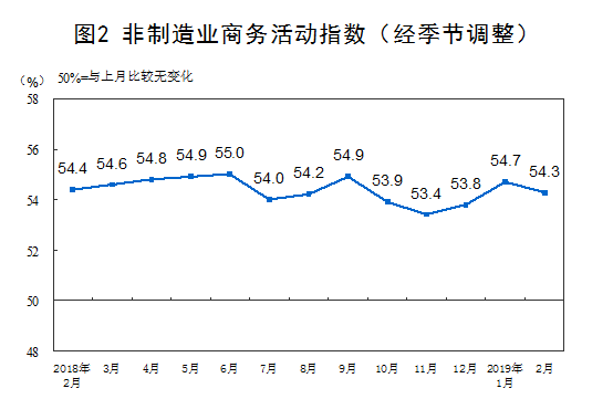 2019年2月份,中国非制造业商务活动指数为54.3%,比上月回落0.4个百分点,表明非制造业总体继续保持增长。