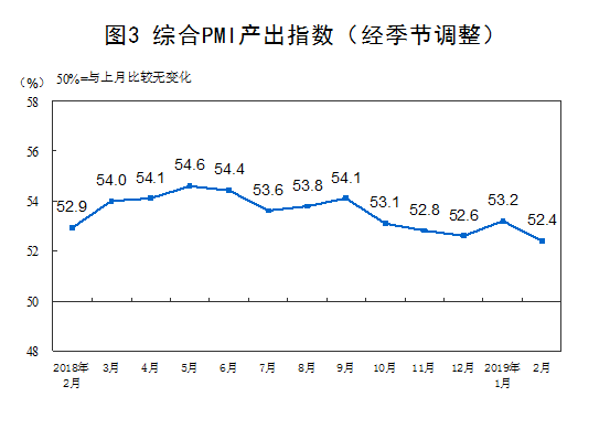 2019年2月份,综合PMI产出指数为52.4%,比上月回落0.8个百分点,表明我国企业生产经营活动总体保持扩张,但扩张步伐比上月放缓。