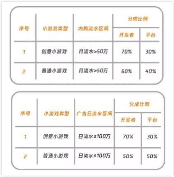 分成方面,以抖音为例,普通游戏,广告日流水不超过100万的部分,开发者可以拿到60%,超过100万的部分开发者保留50%;而首发游戏这两个档位的开发者保留比例分别是70%和60%。相比微信平台对于非创意小游戏的广告分成,抖音平台给开发者的分成比例略高一些。