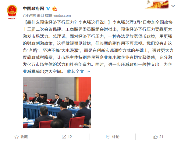靠什么顶住经济下行压力?顶住经济下行压力要靠更大激发市场活力。总理说,面对经济下行压力,一种办法是放宽货币政策,用更强的财政刺激政策,这样做短期见效快,但长期的副作用不可忽视。我们没有走这条“老路”,坚决不搞“大水漫灌”,而是在创新宏观调控方式的基础上,通过更大力度简政减税降费,让市场主体特别是民营企业和小微企业有切实获得感,充分激发亿万市场主体的活力和社会创造力。同时,进一步压减政府一般性支出,为企业减税腾出更大空间。