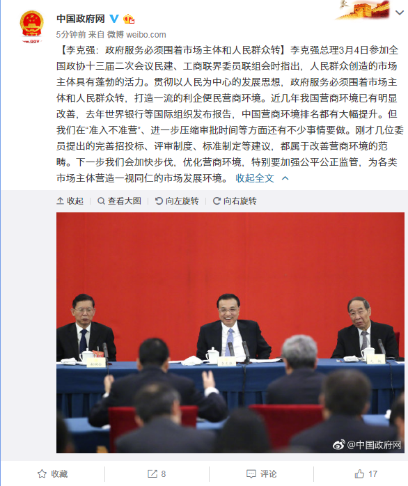 李克强总理还指出,人民群众创造的市场主体具有蓬勃的活力。贯彻以人民为中心的发展思想,政府服务必须围着市场主体和人民群众转,打造一流的利企便民营商环境。近几年我国营商环境已有明显改善,去年世界银行等国际组织发布报告,中国营商环境排名都有大幅提升。但我们在“准入不准营”、进一步压缩审批时间等方面还有不少事情要做。刚才几位委员提出的完善招投标、评审制度、标准制定等建议,都属于改善营商环境的范畴。下一步我们会加快步伐,优化营商环境,特别要加强公平公正监管,为各类市场主体营造一视同仁的市场发展环境。