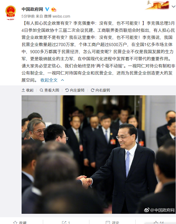 3月4日晚间,据中国政府网官方微博消息,李克强总理3月4日参加全国政协十三届二次会议民建、工商联界委员联组会时指出,有人担心民营企业政策是不是有变?我在这里重申:没有变,也不可能变!李克强说,我国民营企业数量超过2700万家,个体工商户超过6500万户,在全国1亿多市场主体中,9000多万都属于民营经济,怎么可能变呢?民营企业不仅是我国发展的生力军,更是吸纳就业的主力军,在中国现代化进程中发挥着不可替代的重要作用。请大家务必坚定信心,我们会始终坚持“两个毫不动摇”。一视同仁对待公有制和非公有制企业,一视同仁对待国有企业和民营企业,进而为民营企业创造更大的发展空间。