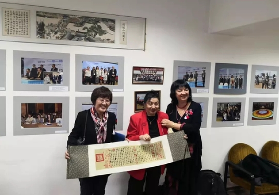 中国新闻代表团团长王冬梅(左)出席索菲亚中国摄影展开幕式