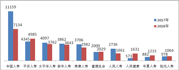 人身保险公司销售纠纷投诉量居前10位的为:中国人寿3097件,同比下降40.65%;平安人寿1971件,同比增长14.66%;新华人寿1894件,同比下降15.93%;太平洋人寿1686件,同比下降5.70%;泰康人寿1518件,同比下降28.70%;富德生命988件,同比下降21.65%;人民人寿907件,同比下降48.20%;阳光人寿850件,同比增长13.18%;华夏人寿490件,同比增长37.25%;太平人寿376件,同比下降55.61%。