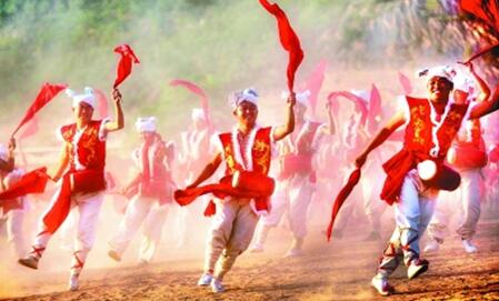 陕西省延安市安塞区冯家营村文化大舞台上,村民在表演安塞腰鼓。新华社发