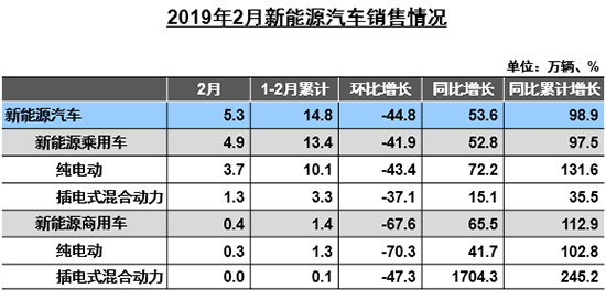 2月,新能源汽车市场产销分别完成5.9万辆和5.3万辆,同比分别增长50.9%和53.6%;1-2月,新能源汽车累计产销分别完成15万辆和14.8万辆,比上年同期分别增长83.5%和98.9%。